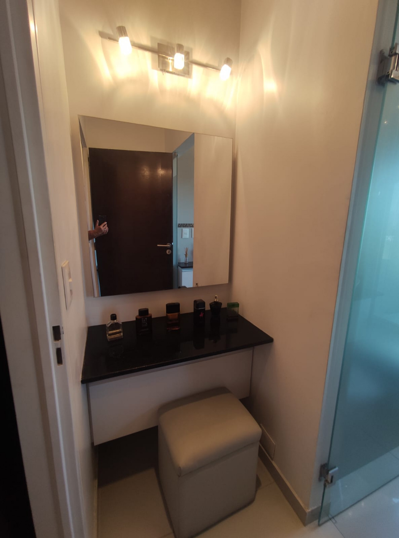 Pasillo. Suite: vestidor de pared a pared, ventanal en L con unas vistas increíbles. Ante baño con doble mesada de mármol negro mueble de colgar de 2 puertas de vidrio esmerilado, puerta de vidrio ídem a sector sanitarios: bañera Hidromasaje, ventana de 2 hojas, calienta toallas.